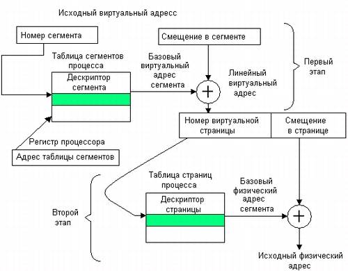 Наличие базового виртуального адреса сегмента в дескрипторе позволяет однозначно преобразовать адрес, заданный в виде пары (номер сегмента, смещение в сегменте), в линейный виртуальный адрес байта, который затем преобразуется в физический адрес страничным механизмом.