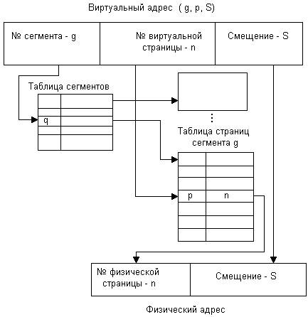Рассмотрим еще одну возможную схему управления памятью, основанную на комбинировании сегментного и страничного механизмов. Так же как и в предыдущих случаях, виртуальное пространство процесса делится на сегменты, а каждый сегмент, в свою очередь, делится на виртуальные страницы. Первое отличие состоит в том, что виртуальные страницы нумеруются не в пределах всего адресного пространства процесса, а в пределах сегмента. Виртуальный адрес в этом случае выражается тройкой (номер сегмента, номер страницы, смещение в странице).