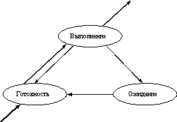 ГОТОВНОСТЬ - также пассивное состояние процесса, но в этом случае процесс заблокирован в связи с внешними по отношению к нему обстоятельствами: процесс имеет все требуемые для него ресурсы, он готов выполняться, однако процессор занят выполнением другого процесса.