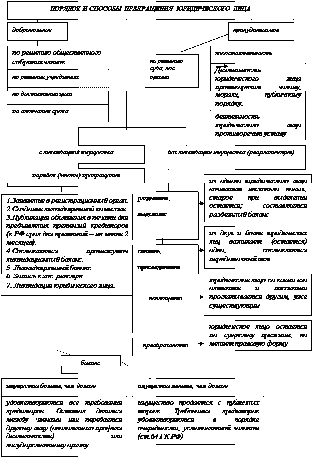 Ликвидация может быть добровольной и принудительной. Добровольная ликвидация осуществляется по решению индивидуального предпринимателя, учредителей (участников) юридического лица либо органа юридического лица, уполномоченного на то учредительными документами. Решение о ликвидации государственного или муниципального предприятия может принять собственник.