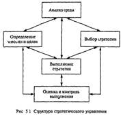 Стратегическое управление можно рассматривать как динамическую совокупность пяти взаимосвязанных управленческих процессов. Эти процессы логически вытекают (или следуют) один из другого. Од- нако существует устойчивая обратная связь и, соответственно, обратное влияние каждого процесса на остальные и на всю их совокупность, это является важной особенностью системы стратегического управления. Схематически структура стратегического управления изображена на рис. 5.1.