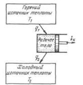 Как показал опыт, все без исключения тепловые двигатели должны иметь горячий источник теплоты, рабочее тело, совершающее замкнутый процесс — цикл, и холодный источник теплоты.