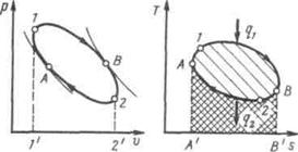 Для того чтобы двигатель непрерывно производил механическую энергию, работа расширения должна быть больше работы сжатия. Поэтому кривая сжатия 2A1 должна лежать ниже кривой расширения. Затраченная в процессе 2A1 работа изображается площадью 2A11´2´. В результате каждый килограмм рабочего тела совершает за цикл полезную работу l ц, эквивалентную площади 1В2А1, ограниченной контуром цикла. Цикл можно разбить на два участка: A1B, на котором происходит подвод теплоты q 1 , и B2A, на котором происходит отвод теплоты q 2. В точках А и В нет ни подвода, ни отвода теплоты, и в этих точках поток теплоты меняет знак. Таким образом, для непрерывной работы двигателя необходим циклический процесс, в котором к рабочему телу от горячего источника подводится теплота q 1и отводится от него к холодному теплота q 2. B T,s - диаграмме теплота q 1эквивалентна площади A´A1BB ´,a q2 — площади A´A2BB´.