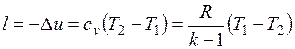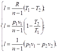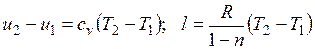Работа расширения при адиабатном процессе согласно первому закону термодинамики совершается за счет уменьшения внутренней энергии и может быть вычислена по одной из следующих формул: