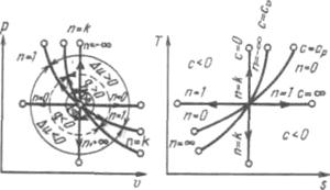 На рисунке показано взаимное расположение на р, V- и Т, s-диаграммах политропных процессов с разными значениями показателя политропы. Все процессы начинаются в одной точке («в центре»).
