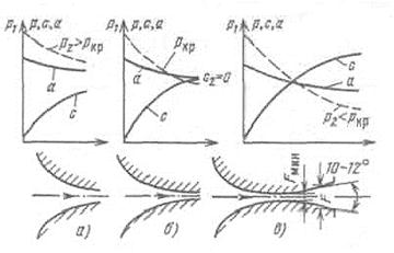 При более низком давлении за соплом можно получить режим, изображенный на рисунке б. В этом случае скорость на выходе из сопла равна скорости звука в вытекающей среде. Внутри сопло по-прежнему должно суживаться (dF<0), и только в выходном сечении dF=0.