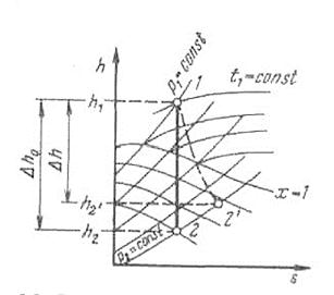 На рисунке неравновесный процесс адиабатного расширения пара изображен условно штриховой линией 1-2’. При том же перепаде давлений