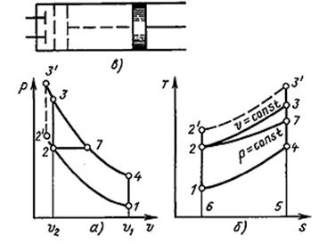 Теоретический цикл ДВС состоит из адиабатного сжатия 1-2 рабочего тела в цилиндре, изохорного 2-3 или изобарного 2-7 подвода теплоты, адиабатного расширения 3-4 или 7-4 и изохорного отвода теплоты 4-1. В реальных двигателях подвод теплоты осуществляется путем сжигания топлива. Если пары бензина перемешаны с необходимым для горения воздухом до попадания в цилиндр, смесь сгорает в цилиндре практически мгновенно, подвод теплоты оказывается близким к изохорному. Если же в цилиндре сжимается только воздух и уже затем впрыскивается топливо, то его подачу можно отрегулировать таким образом, чтобы давление в процессе сгорания оставалось приблизительно постоянным, и условно можно говорить об изобарном подводе теплоты.