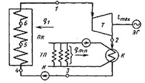 Рисунок 8.12 - Схема установки для совместной выработки тепловой и электрической энергии: ПК. — паровой котел; Т — паровая турбина; К — конденсатор-подогреватель; Н — насос; ТП — тепловой потребитель. Цифры соответствуют точкам цикла в Т,s диаграмме