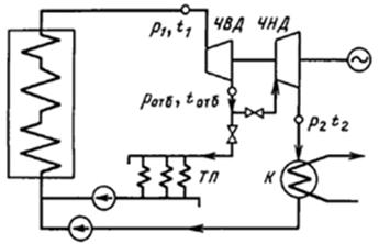 до давления рот6, необходимого для теплового потребителя, и части низкого давления (ЧНД), где пар расширяется до давления р 2 в конденсаторе. Через ЧВД проходит весь пар, вырабатываемый котлоагрегатом. Часть его