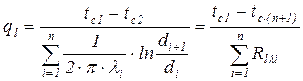 аналогично теплопередаче через плоскую стенку, линейную плотность теплового потока через многослойную цилиндрическую стенку при стационарном режиме можно записать: