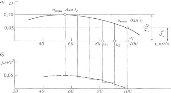 Если, например, автомобиль въезжает на участок с большим продольным уклоном i 2, то из-за избытка его живой силы затрачиваемой на преодоление дополнительного подъема, скорость движения изменяется постепенно. При этом отрицательное ускорение при замедлении постепенно уменьшается. Когда оно уменьшится до нуля, дальнейшее движение происходит с постоянной скоростью. Протяженность участка, на котором вновь устанавливается равновесная скорость, можно определить приближенным способом, принимая ускорение в малых интервалах изменения скоростей постоянным. В начале на основе графика динамических характеристик (рис. 3, а) строят вспомогательную кривую ускорений, вычитая из значений динамического фактора для vi2, значения дорожных сопротивлений f + i 2 (рис. 3, б).