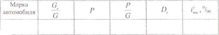Марка автомобиля | D,н/н | v, км/ч | fv | imax, 0/00 | Скорость движения при уклоне 30 0/0, км/ч |