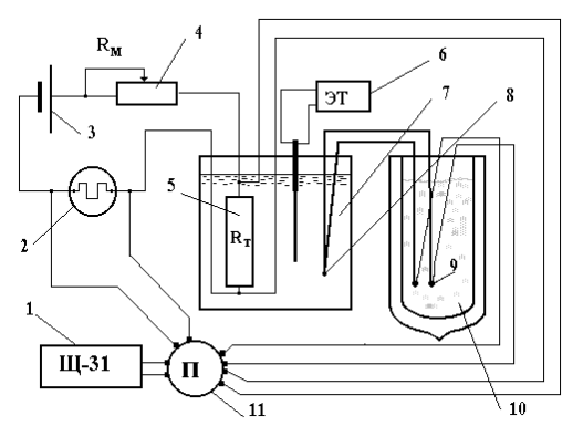 Измерение электрического сопротивления термометра осуществляют с помощью измерения: 1) напряжения U т на резисторе 9 и 2) напряжения U к на образцовой катушке 2. Величину сопротивления находят по соотношению