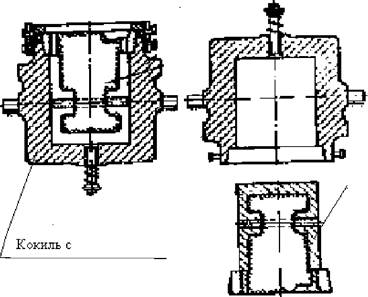 Особенностью литья в металлическую форму (в кокиль) (рис.3.3) является невозможность разрушения формы после заливки, поэтому кокиль проектируется так, чтобы отливку можно было извлечь простым переворачиванием формы или разъемом ее по плоскостям стыка.