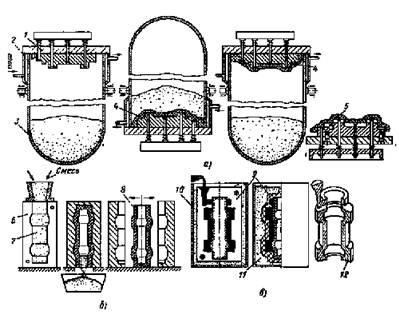 Выдержав эту смесь на поверхности нагретой заготовки определенное время, получают слой смеси, в котором частицы пластмассы расплавились и полимеризовались, образовав твердую корку (оболочку) на поверхности модели. При переворачивании резервуара излишняя смесь ссыпается, а корка, с помощью специальных выталкивателей, снимается с модели (а). Далее, полученные таким образом оболочки, соединяют между собой склеиванием силикатным клеем, устанавливают в опоках и засыпают песком, для обеспечения прочности при заливке металла (в). Также получают керамические стержни для формирования внутренних полостей отливок (б).