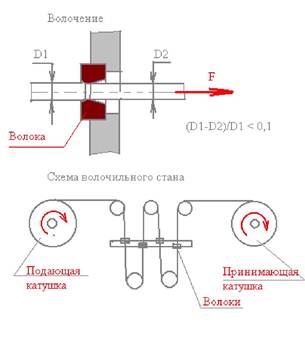 Процесс обжатия металла заготовки при протаскивании ее через волоку -инструмент с отверстием, сечение которого меньше исходного сечения заготовки (Рис.4.4).