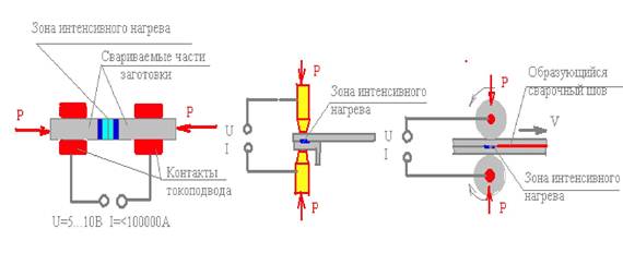 Электроконтактные виды сварки (рис.5.7) основаны на нагреве зоны контакта двух частей заготовки в зоне их стыка при их механическом сдавливании. Процесс может быть реализован, если электрическое сопротивление контакта заготовок превышает сопротивление всей электрической цепи. Тогда в зоне контакта будет выделяться тепловая мощность W = I 2 * Rk