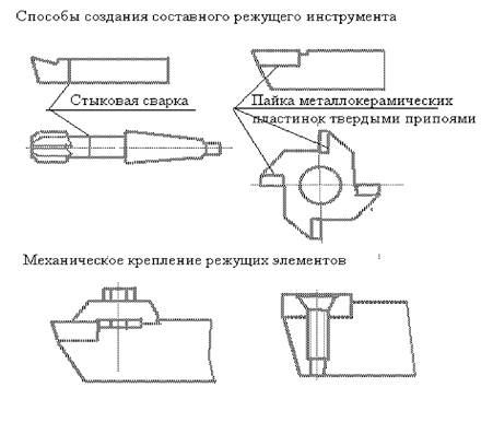 Инструментальные материалы достаточно дороги, поэтому инструмент изготавливают обычно составным, выполняя из инструментального материала только режущую часть, которая соединяется с остальной частью (корпусом,державкой...) с помощью сварки, пайки или механического крепления (рис.6.3).