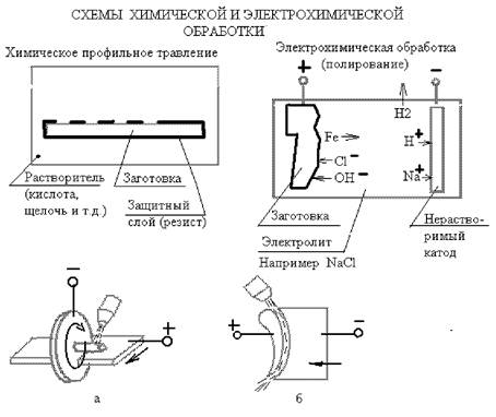 Химическая обработка (рис.8.2) основана на растворении определённых областей обрабатываемого изделия в активных растворителях. Большинство металлов растворяется в кислотах, но есть металлы (например, алюминий) хорошо растворяющиеся в щелочах. Ограничение областей растворения осуществляется за счет покрытия защищаемых зон каким либо веществом, не реагирующим с растворителем.