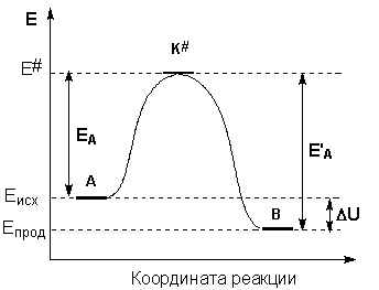 Образование активированного комплекса всегда требует затраты некоторого количества энергии, что вызвано, во-первых, отталкиванием электронных оболочек и атомных ядер при сближении частиц и, во-вторых, необходимостью построения определенной пространственной конфигурации атомов в активированном комплексе и перераспределения электронной плотности. Таким образом, по пути из начального состояния в конечное система должна преодолеть своего рода энергетический барьер. Энергия активации реакции приближённо равна превышению средней энергии активированного комплекса над средним уровнем энергии реагентов. Очевидно, что если прямая реакция является экзотермической, то энергия активации обратной реакции Е'А выше, нежели энергия активации прямой реакции EA. Энергии активации прямой и обратной реакции связаны друг с другом через изменение внутренней энергии в ходе реакции. Вышесказанное можно проиллюстрировать с помощью энергетической диаграммы химической реакции (рис. 2.5).