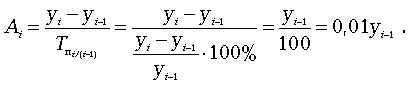Абсолютное значение одного процента прироста Ai. Этот показатель служит косвенной мерой базисного уровня. Представляет собой одну сотую часть базисного уровня, но одновременно представляет собой и отношение абсолютного прироста к соответствующему темпу роста.