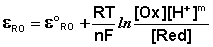 Зависимость потенциала редокс-электрода εRO от концентрации (активности) окисленной [Ox] и восстановленной форм [Red] для окислительно-восстановительной реакции, в которой не участвуют никакие другие частицы, кроме окислителя и восстановителя, имеет следующий вид (здесь n – число электронов, участвующих в элементарном акте окислительно-восстановительной реакции):