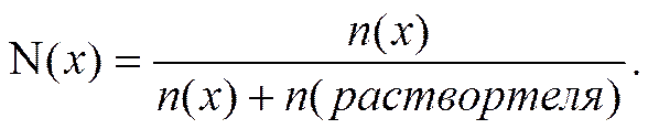 2) Мольная доля (N) – отношение количества молей растворенного вещества к общему числу молей раствора. В случае двухкомпонентного раствора формула имеет вид