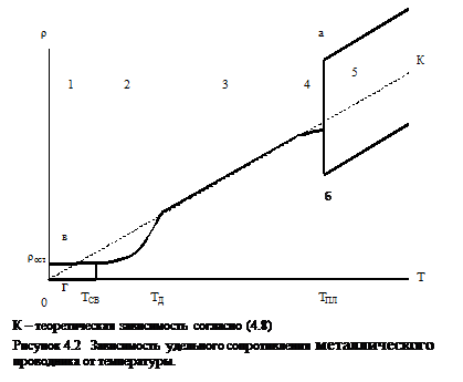 На участке 3 при комнатных температурах зависимость ρ = ¦(Т) линейна, как это видно из (4.8). То есть с ростом температуры возрастает амплитуда тепловых колебаний узлов кристаллической решетки, что уменьшает длину свободного пробега электронов.