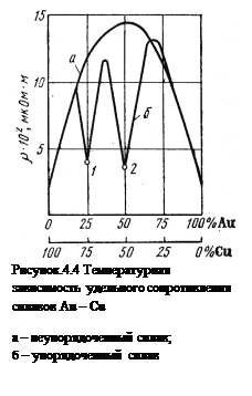 То есть в бинарных твердых растворах А-В остаточное сопротивление возрастает, как при добавлении атомов металла В к металлу А, так и при добавленные атомов металла А к металлу В (рис. 4.4). Остаточное сопротивление достигает максимума при xА = xВ = 0,5.