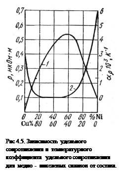 Наличие примесей уменьшает значение αρ. У некоторых сплавов αρ. даже может приобретать небольшие отрицательные значения (рис.4.5). Это объясняют тем, что при более сложных составе и структурax по сравнению с чистыми металлами сплавы нельзя рассматривать как классические металлы, т. е. изменение проводимости их обусловливается не только изменением подвижности носителей заряда но в некоторых случаях и частичным возрастанием концентрации носителей при повышении температуры. Сплав, у которого уменьшение подвижности с увеличением температуры компенсируется возрастанием концентрации носителей заряда, имеет нулевой температурный коэффициент удельного сопротивления.