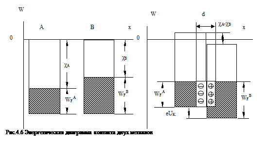 При соприкосновении двух разных металлов, между ними возникает контактная разность потенциалов. Согласно квантовой теории причиной этого является различная энергия Ферми соприкасающихся металлов. Пусть в изолированном состоянии электронный газ в металлах А и В имеет энергию Ферми WFA и WFB, отсчитываемую от дна зоны проводимости (рис.4.6).