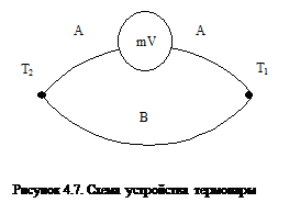 Термоэлемент, который построен из двух различных металлических проводников с замкнутой цепью, называют термопарой (рис.4.7).