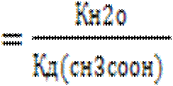 В полученном выражении концентрацию воды можно перенесли влево, так как в разбавленных водных растворах её исходная и равновесная концентрации практически совпадают. И после умножения числителя и знаменателя отношения на концентрацию ионов водорода, получим в числителе ионное произведение воды, а в знаменателе константу диссоциации уксусной кислоты.