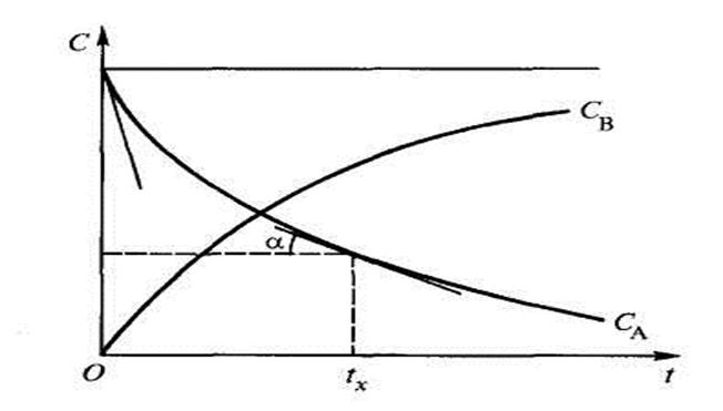 Например, в ходе реакции А ® В концентрация исходного вещества А уменьшается, а продукта реакции В – увеличивается и кинетическая кривая имеет вид (рисунок 1).