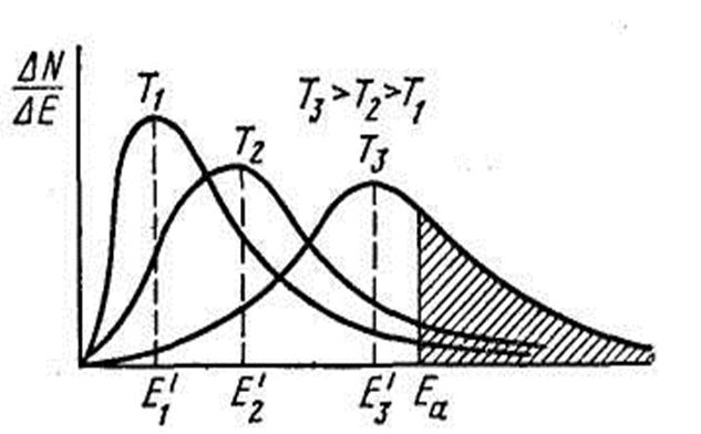 Е1, Е2 и Е3 – наиболее вероятные значения энергии при температурах соответственно Т1, Т2 и Т3,Еа – энергия активации.