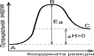 На рисунке 3 показана зависимость изменения потенциальной энергии реагирующей системы от пути протекания реакции. Из приведенного рисунка видно, что для экзотермической реакции (идущей с выделением теплоты) убыль активных молекул восполняется за счет энергии, выделяющейся в ходе реакции. В случае эндотермической реакции для поддержания необходимой скорости реакции требуется подвод тепла.