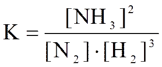 Подставляя в условие химического равновесия выражения скоростей прямой и обратной реакций получаем следующее равенство Кпр [N2][H2]3 = Кобр[NH3]2.