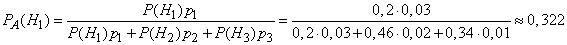 Пример. На склад поступило 1000 подшипников. Из них 200 изготовлены на 1-м заводе, 460—на 2-м и 340 - на 3-м. Вероятность того, что подшипник окажется нестандартным, для 1-го завода равна 0,03, для 2-го — 0,02, для 3-го — 0,01. Взятый наудачу подшипник оказался нестандартным. Какова вероятность того, что он изготовлен 1-м заводом? Решение: Пусть A — событие, состоящее в том, что взятый Подшипник нестандартный, а