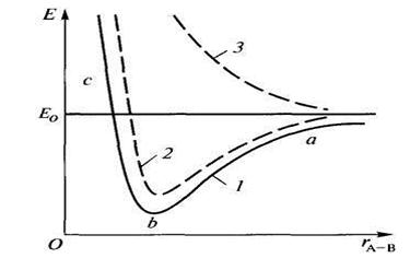 Из рисунка 1 следует, что по мере сближения атомов с параллельными спинами (кривая 3) энергия системы резко возрастает, то есть химическая связь не образуется. Если спины атомов антипараллельны (противоположны по знаку), то с уменьшением расстояния между атомами энергия системы вначале уменьшается, проходя через некий минимум (участок a-b), а затем увеличивается (участок b-c). Следовательно, образование химической связи возможно, если спины атомов антипараллельны.