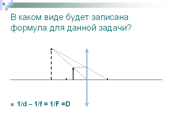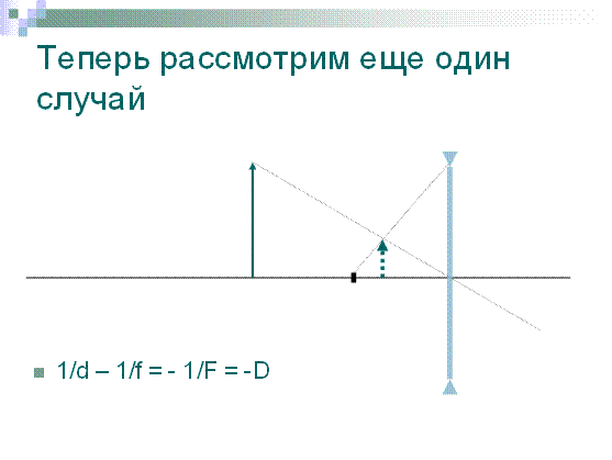 Для рассеивающей линзы изображение предмета мнимое и значения f и d/ надо брать со знаком “минус”.