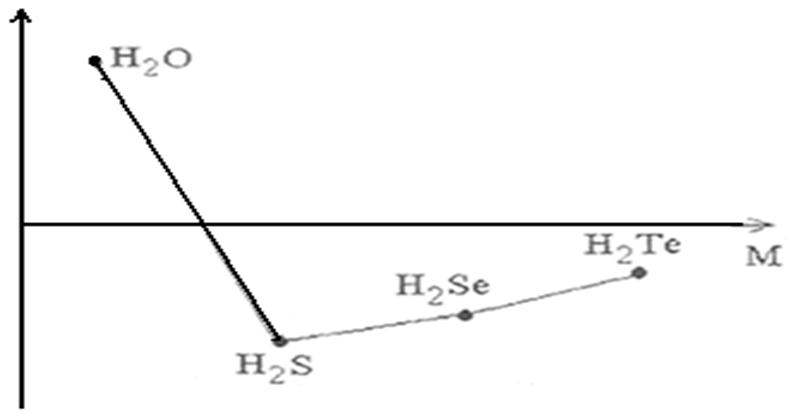 В ряду Н2O – Н2S − Н2Sе − Н2Те с увеличением молекулярных масс должно наблюдаться повышение температур кипения. Как видно из рисунка 3 данная зависимость соблюдается, за исключением Н2О. Установлено, что аномальное повышение температуры кипения Н2О является следствием образования водородных связей между отдельными молекулами воды.