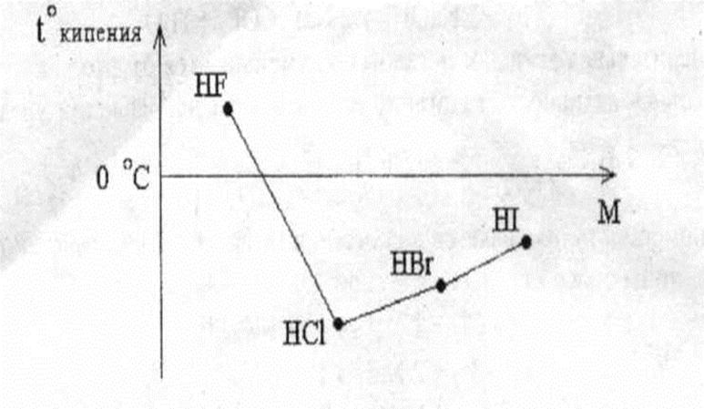 Подтверждением водородной связи между молекулами Н–F является аномально высокая температура кипения Н–F. На рисунке 2 приведена графическая зависимость температур кипения кислот галогенов от их мольной массы.