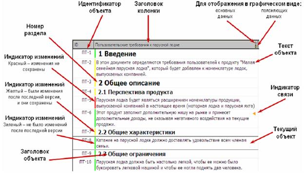 Объект, выделенный сверху и снизу более темными горизонтальными линиями, носит название «текущего объекта» (Current Object). Большинство функций в системе DOORS, выполняемых в рамках данного модуля (напр., создание нового объекта, вставка объекта, перемещение объекта и т.д.), выполняются по отношению к текущему объекту. Зеленые, желтые и красные полоски с левой стороны текстовой колонки являются индикаторами изменений (Change Bars).