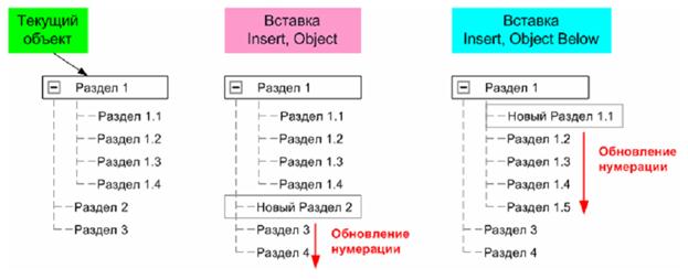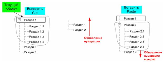 Операция «вырезать» (Cut) убирает текущий объект и все его дочерние (!) объекты из структуры модуля. Эта операция вызывает автоматическое обновление нумерации заголовков всех объектов в модуле так, чтобы устранить образовавшийся разрыв в структуре. Вырезанный объект может быть затем вставлен (Paste), или после текущего объекта на том же уровне иерархии, либо в качестве первого дочернего объекта по отношению к текущему.