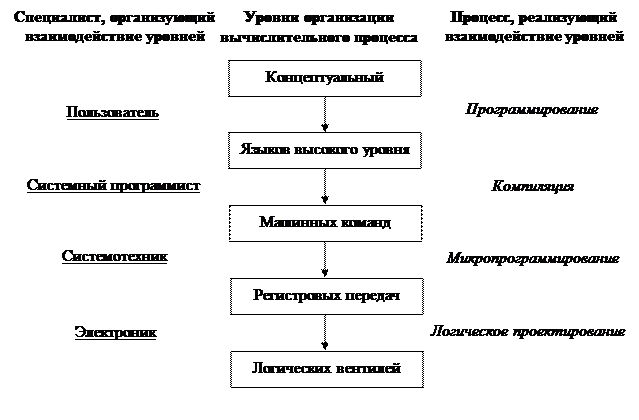 На концептуальном уровне пользователь анализирует задачу, выбирает метод её решения, разрабатывает алгоритм, определяет структуры данных. Затем пишется программа на одном из языков высокого уровня, которая не зависит от архитектуры вычислительной системы и особенностей аппаратного обеспечения. На уровне машинных команд обеспечивается связь программных и аппаратных средств: разрабатывается список команд, определяются способы кодирования операций и адресов, а также другие параметры, заложенные в структуру вычислительной машины. Связь между языками высокого уровня и машинными командами может осуществляться как методом компиляции, так и методом интерпретации. На уровне регистровых передач осуществляется микрооперации, выполняемые аппаратурой вычислительной машины. Это операции передач, запоминания и преобразования кодов, выполняемые пересылкой сигналов между регистрами через логические схемы. Для построения схем на выполнение требуемой микрооперации формируется набор управляющих сигналов – микрокоманда. Последовательность микрокоманд, соответствующая исполнению машинной команды, называется микропрограммой. На уровне логических вентилей, рассматриваются логические схемы, которые выполняют операции над двоичными переменными.