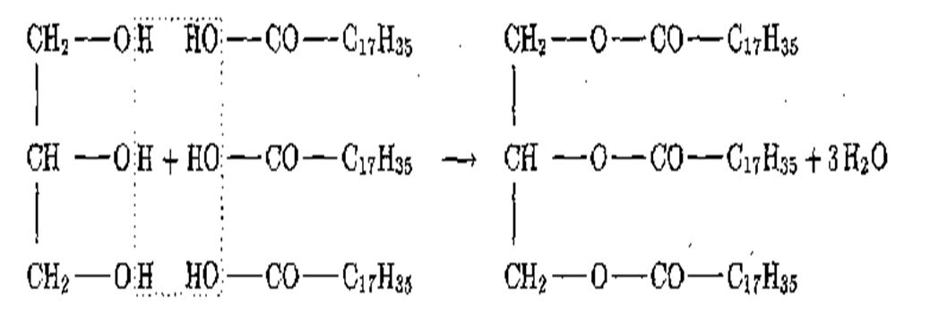 Жиры – это сложные эфиры глицерина и карбоновых кислот. Природные животные и растительные жиры (последние обычно называют маслами) представляют собой смеси сложных эфиров, образованных высшими жирными кислотами и трехатомным спиртом глицерином. Приведем схему образования эфира глицерина и стеариновой кислоты: