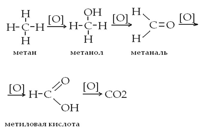 Данная реакция протекает за счет замещения атомов водорода в молекуле метана на кислород. При этом последовательного образуются следующие продукты: