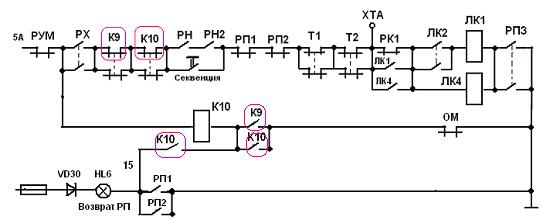 Другие контакты К10 замыкаются в 15 – м проводе цепи управления и включают сигнальную лампу