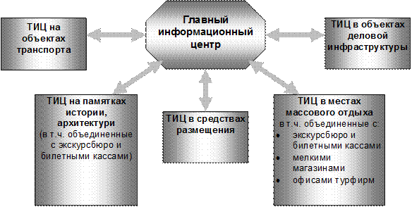 ТИЦ взаимодействуют между собой, образовывая туристическую информационную сеть региона. Другими словами – туристическая информационная сеть города – это система ТИЦ, расположенных в важных с точки зрения информационного обеспечения местах, а также главный информационный центр, который выполняет функцию управления (рис. 3.1).